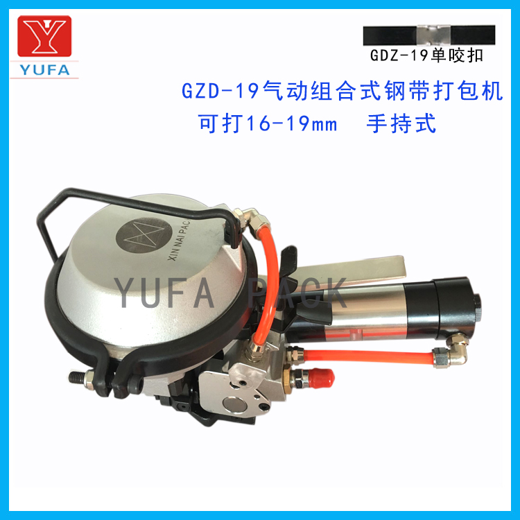 GDZ-19氣動組合式鋼帶打包機具有拉緊、鎖扣、剪斷三個功能。機器有兩個按鍵。分別控制拉緊、鎖扣,使動作連貫準確。使用密合單咬扣。機器重量輕,可單手操作,也可懸掛使用。推扣式氣動束緊,可打包鋼筋,鋼管等不規則物品,適用于各個行。