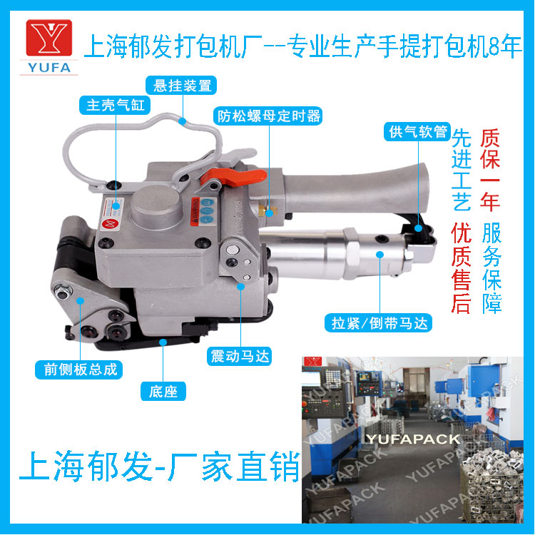 壓縮空氣將氣缸的活塞壓下,活塞與振動器的上部是定位銷連在一起的,振動器壓住打包帶額重疊部分。